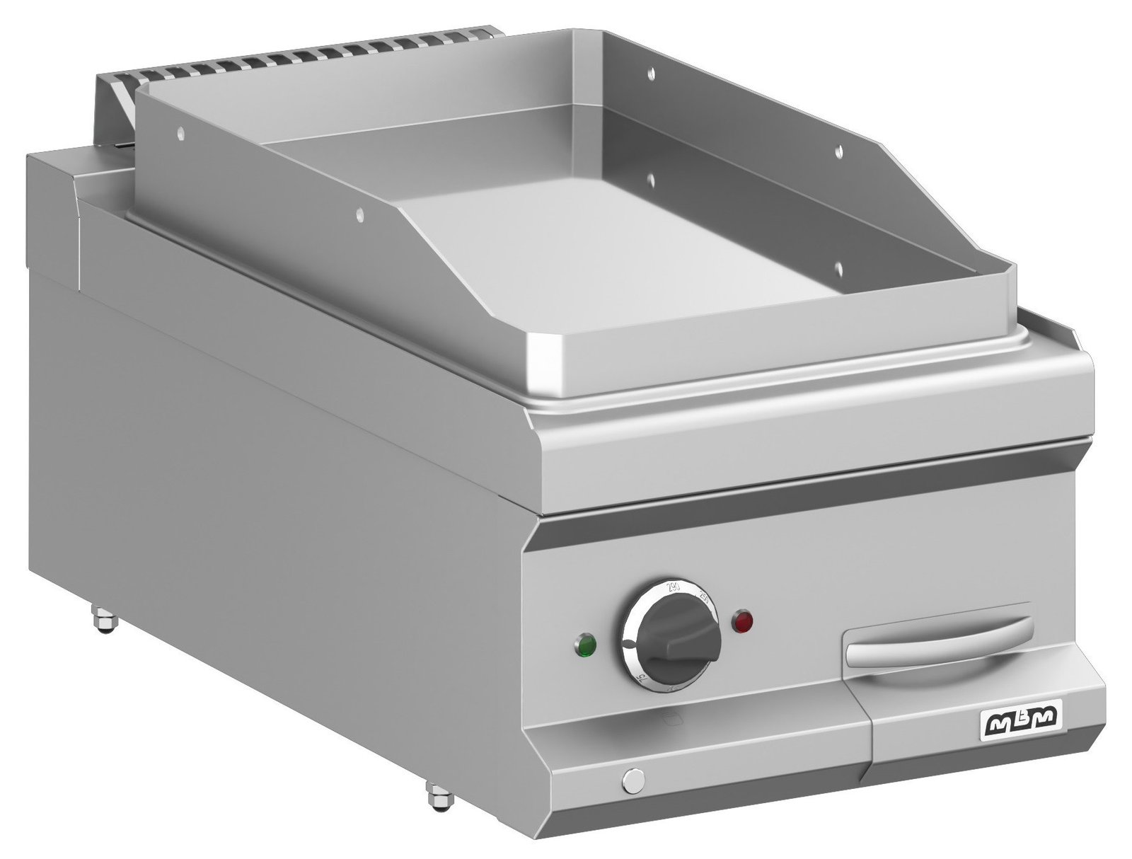 • La placa de cocción totalmente encerrada en la encimera de trabajo está hecha de acero dulce, con acabado pulido o en cromo duro, y tiene espesor de 15 mm.